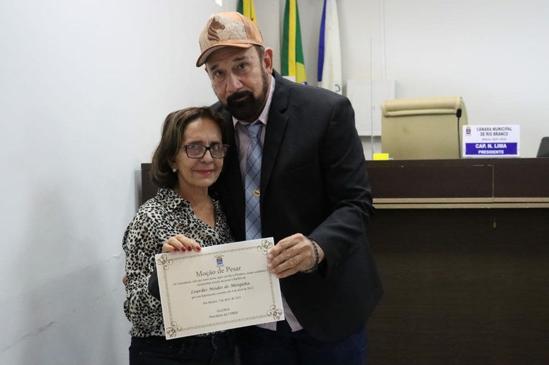 Na ocasião o presidente da Câmara Cap.N.Lima entregou uma Moção de Pesar para os amigos e familiares da servidora Sra. Lourdes Neides, que faleceu no último dia 04 de abril. Dona Lourdes ingressou na Câmara Municipal de Rio Branco em 02 de maio de 1984, aos 25 anos de idade. Por 38 anos dedicou-se a taquigrafia, mesmo tendo tempo suficiente para aposentar, dizia que aqui ela se sentia feliz e alegre.